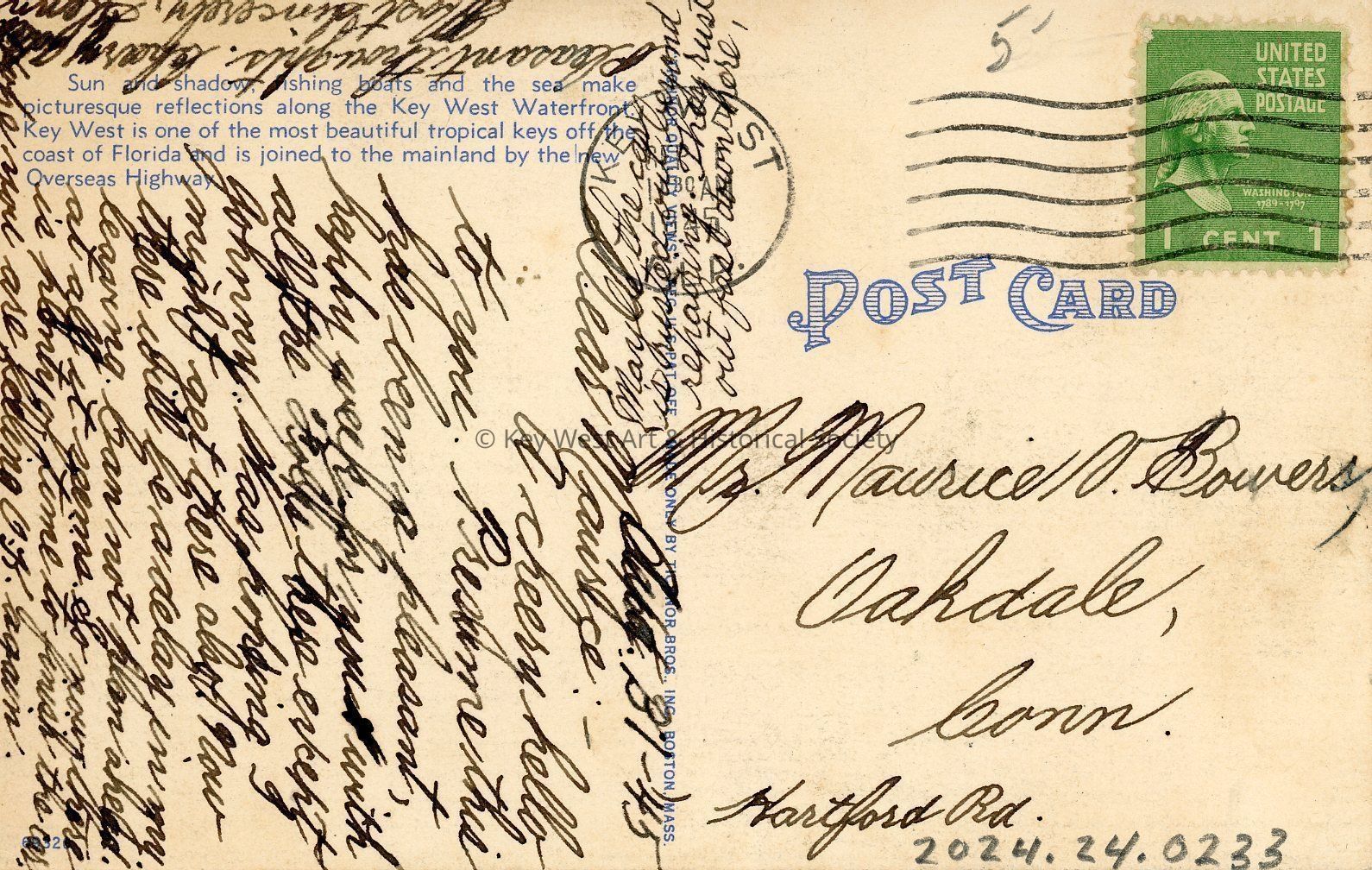 Postcard depicting a fishing boat in the harbor, Key West, Florida. "Sun and shadow, fishing boats and the sea make picturesque reflections along the Key West Waterfront. Key West is one of the most beautiful tropical keys off the coast of Florida and is joined to the mainland by the new Overseas Highway."