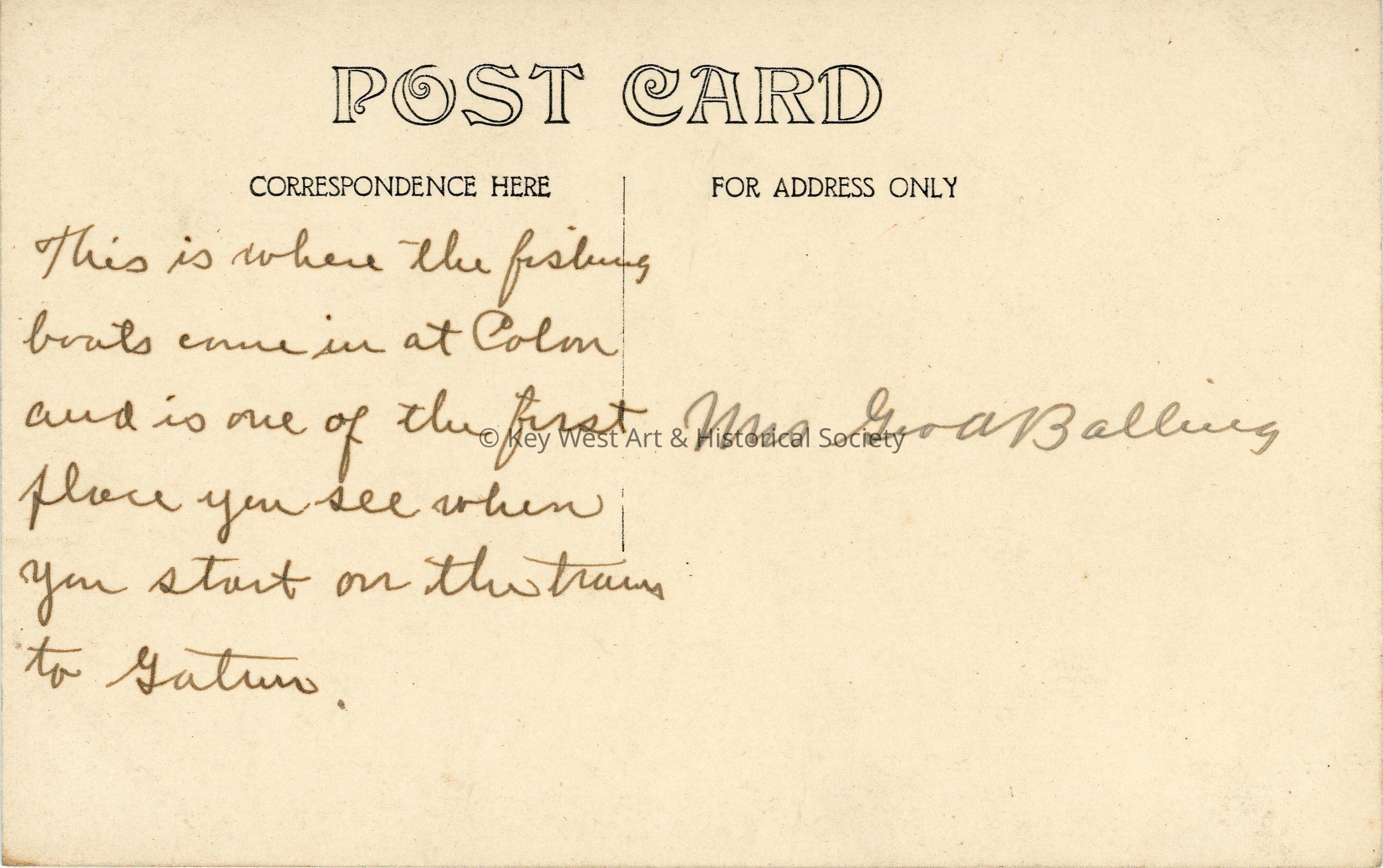 Black and white photograph postcard depicting docked fishing boats in Colon. A sign on a building to the right advertises for 'Vino Tonico Wintersmith' for Malaria treatment. Postcard is addressed to Mrs. Geo. A. Balling.