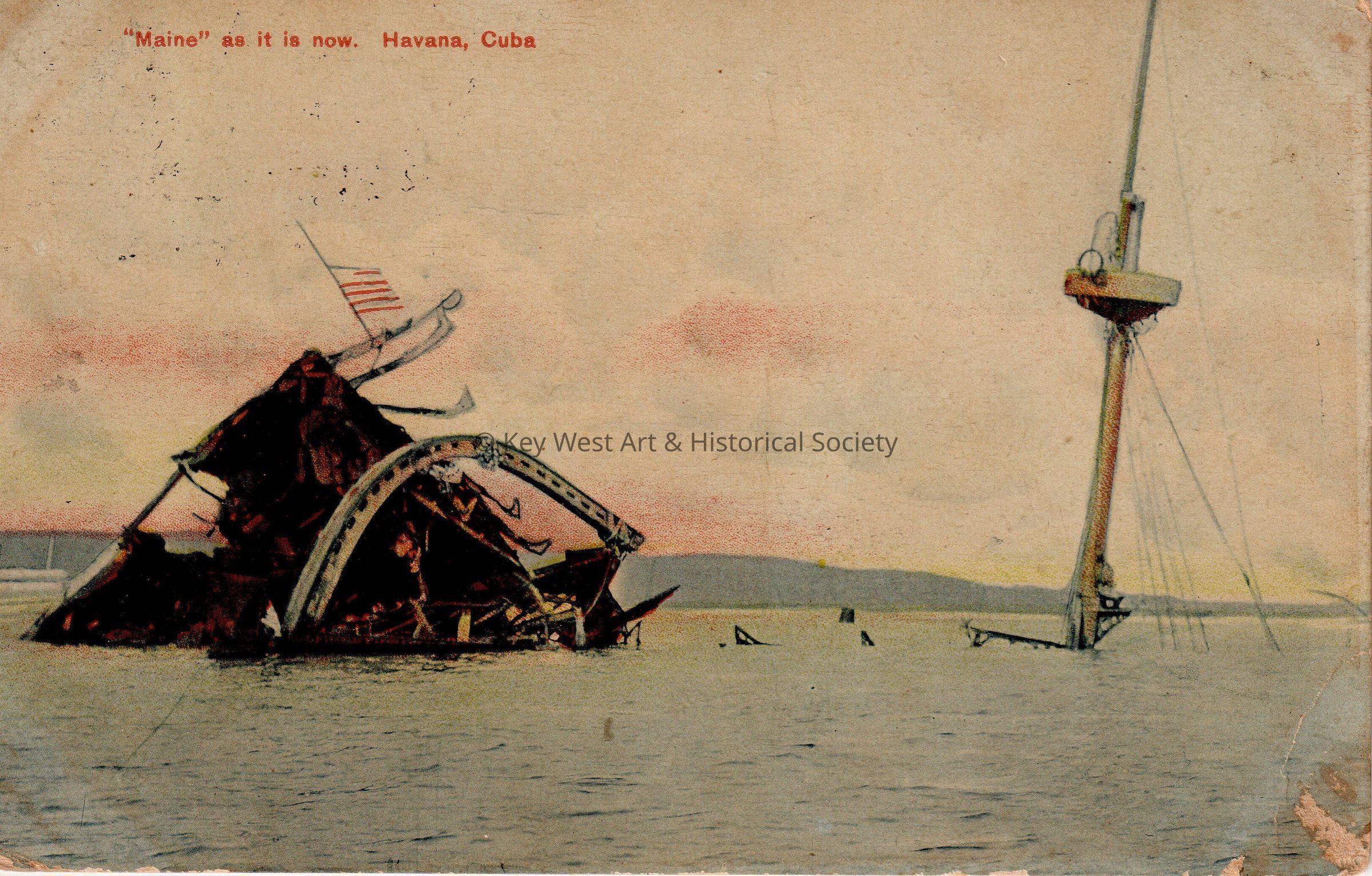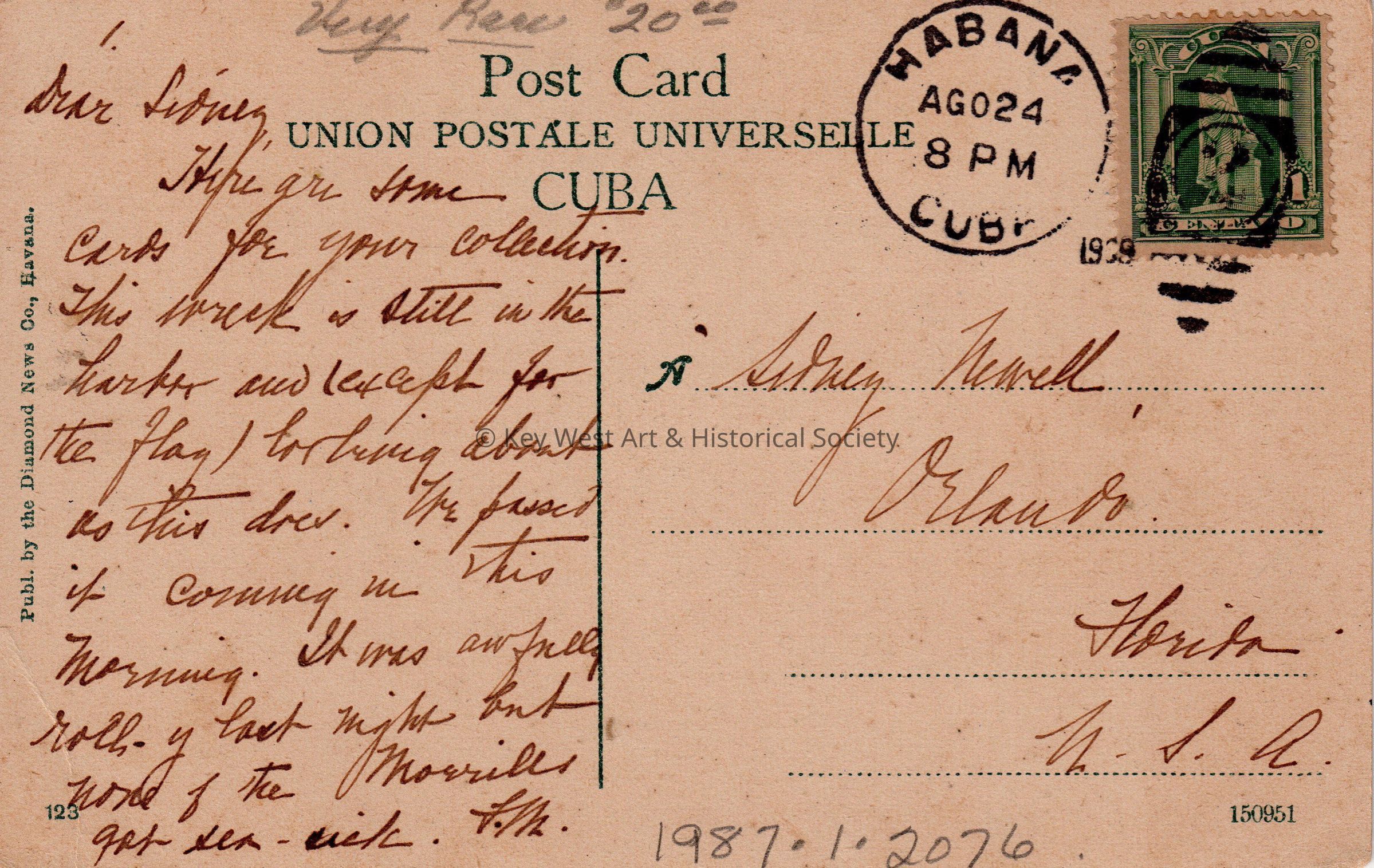 Postcard depicting the shipwreck of the USS MAINE on the bottom of Havana Harbor. The caption reads, ‘"Maine” as it is now. Havana, Cuba’. The message on the verso reads, ‘Dear Sidney, Here are some cards for your collection. The wreck is still in the harbor and except for the flag, looking about as this does. The front is coming in this morning. It was awfully rolly last night but none of the Morrises got sea-sick. F.M.’ The card is addressed to Sidney Newell, Orlando, Florida, U.S.A., and is postmarked Habana, August 24, 1909.