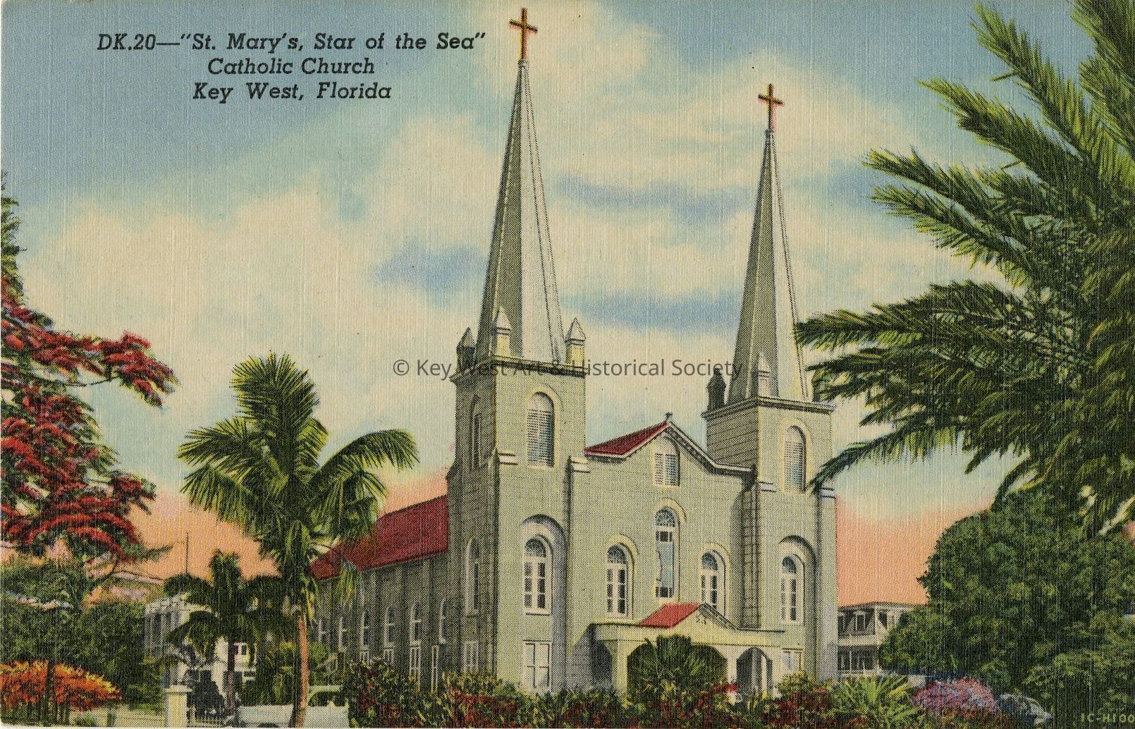 Postcard depicting St. Mary's Star of the Sea Catholic Church in Key West, Florida. This church is located at the corner of Truman Avenue and Windsor Lane.