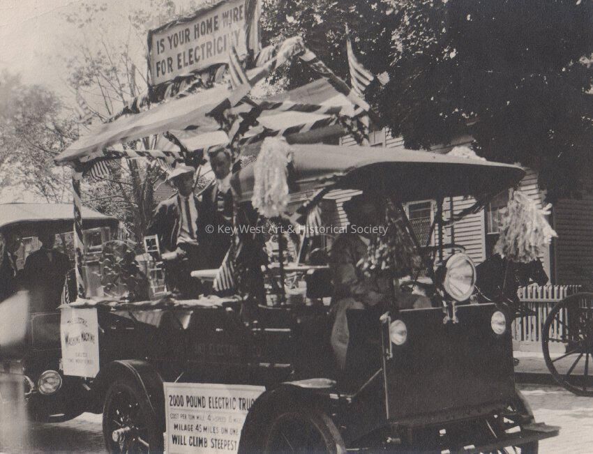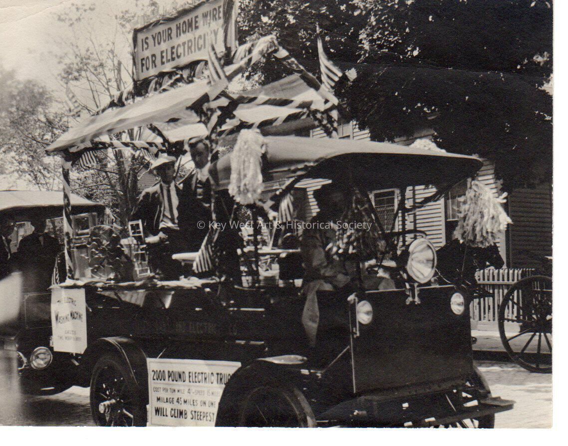 Black and white photo taken July 4, 1910. Image is of the Key West Electric Co. float going down Duval St. for the parade with a sign reading "Is your home wired for electricity?"