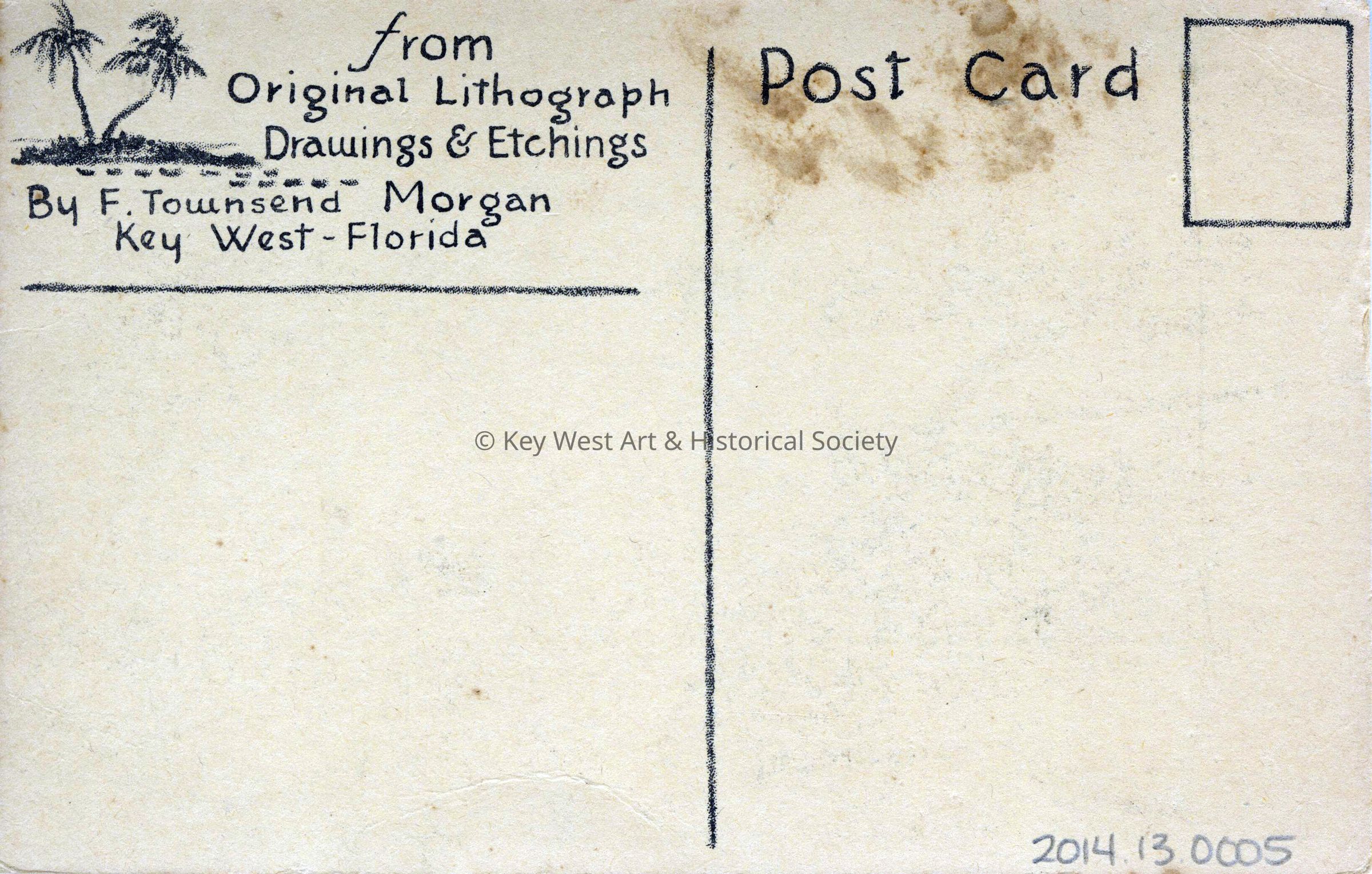 Postcard depicting fishing camps along the Florida Keys taken from a lithograph by Franklin Townsend Morgan. The caption reads, 'Fishing Camps along the Florida Keys - Key West, Florida’.