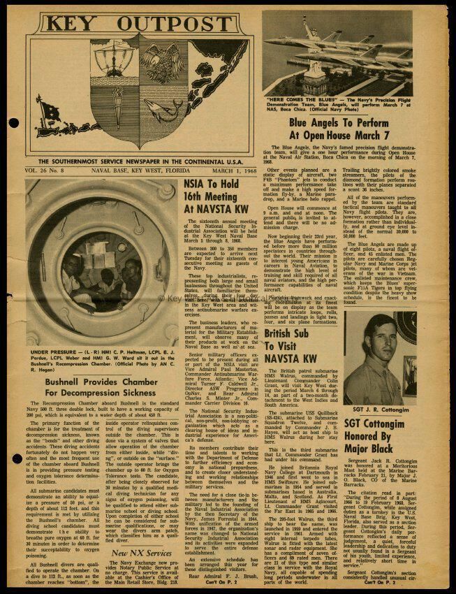 The March 1, 1968 edition of the 'Key Outpost' Newspaper printed by Naval Station Key West as an internal newsletter for military and civilians on base. Volume 26, Number 8. Four pages.
