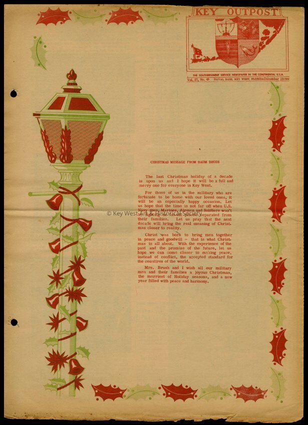 The December 19, 1969 edition of the 'Key Outpost' Newspaper printed by Naval Station Key West as an internal newsletter for military and civilians on base. Volume 27, Number 49. Four pages.